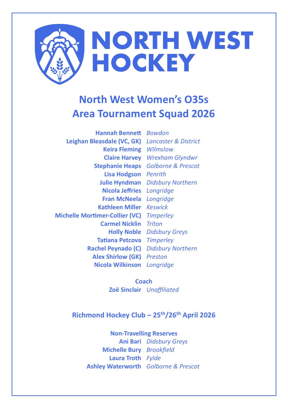 North West Women's O35s Regional Squad Announcement